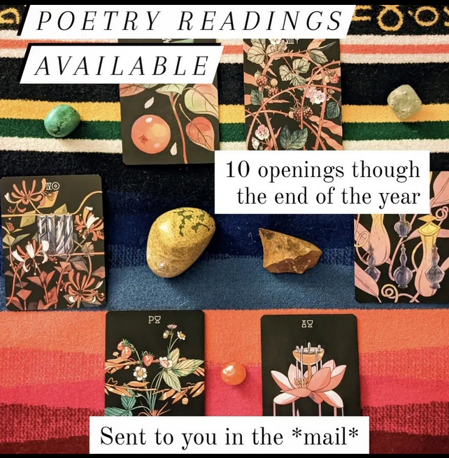 I’d love to pull your cards, write you a poem about it, and send it to you in the mail. For up to 10 folks through the end of the year.